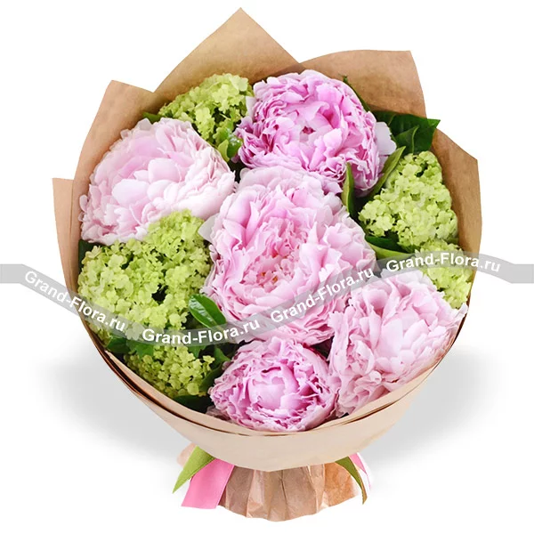 Стандартный: пионы розовые - 6 шт., вибурнум зеленый - 5 шт.,  упаковка, лента.